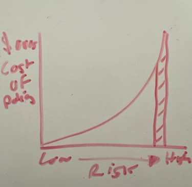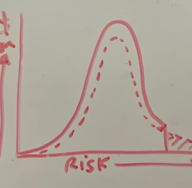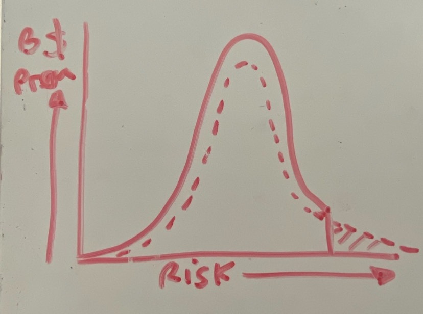This sketch show the current bell curve of premiums paid, but cut off as a % doesn't pay. The dash line shows that premiums decrease as the risk is spread.